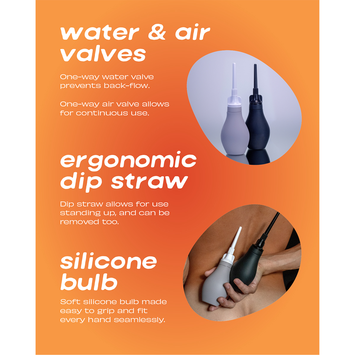 Du douche is the premium douching experience, designed for effortless functionality and usability. An easily removable cap and wide opening are made with quick filling and cleaning in mind. The FDA-grade silicone bulb fits every hand seamlessly and is ideal capacity to prevent over douching. The soft tips ensure a hygienic use and feature a quick-turn connection . Included air/water valves prevent back-flow and allow for uninterrupted use of all the water without having to remove and reinsert. An exceptional experience thoughtfully designed with every user in mind.