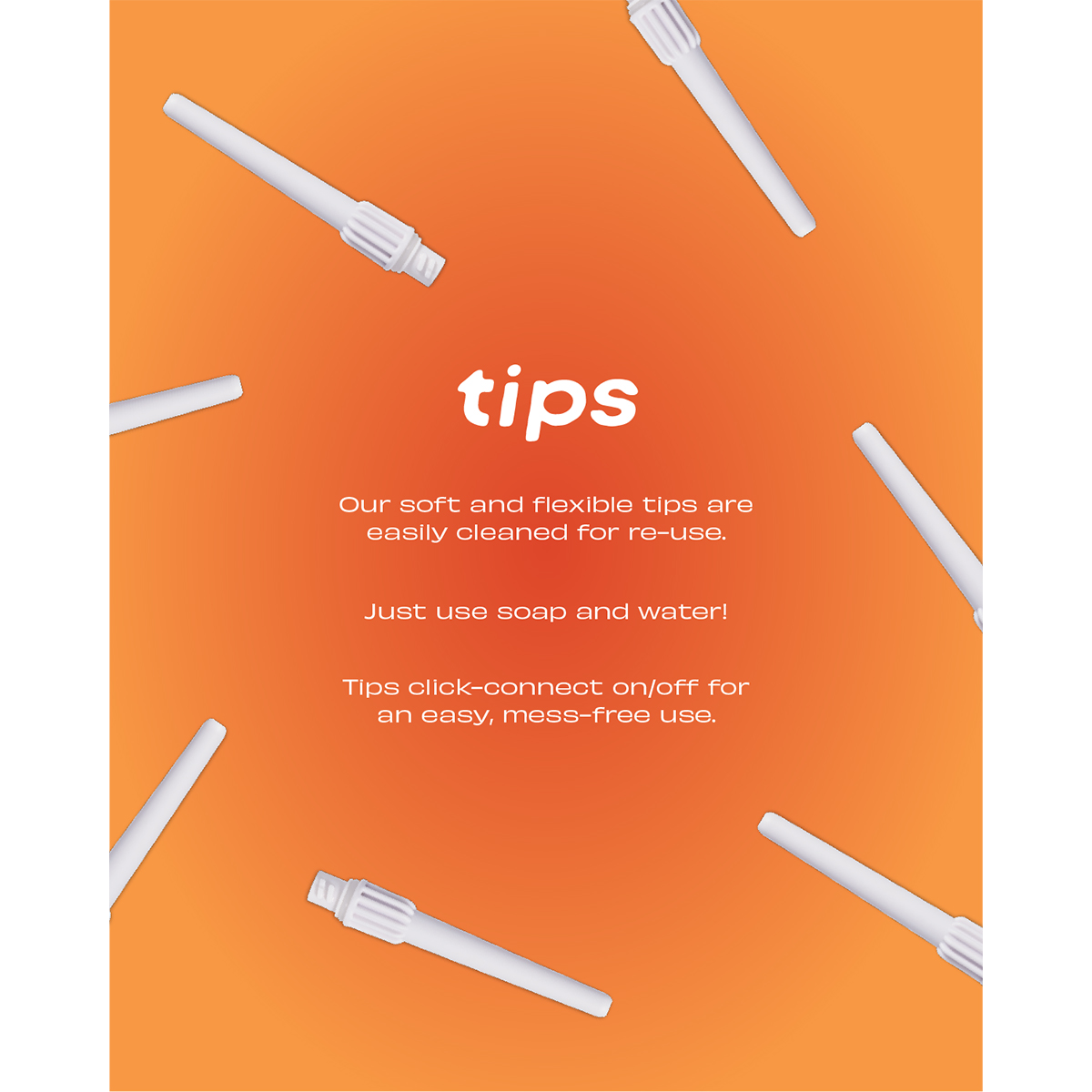 Replaceable Tips – Soft flexible tips are easy to remove and replace with a quick-turn connection. Simply wash & reuse or replace with new one. Kit includes 2 tips
