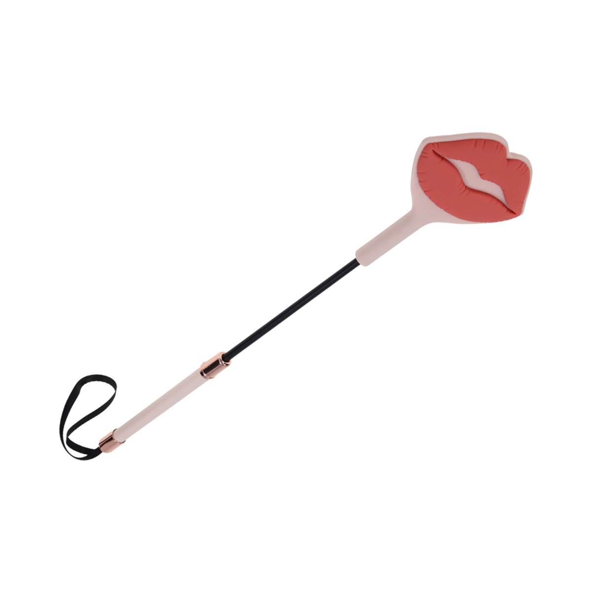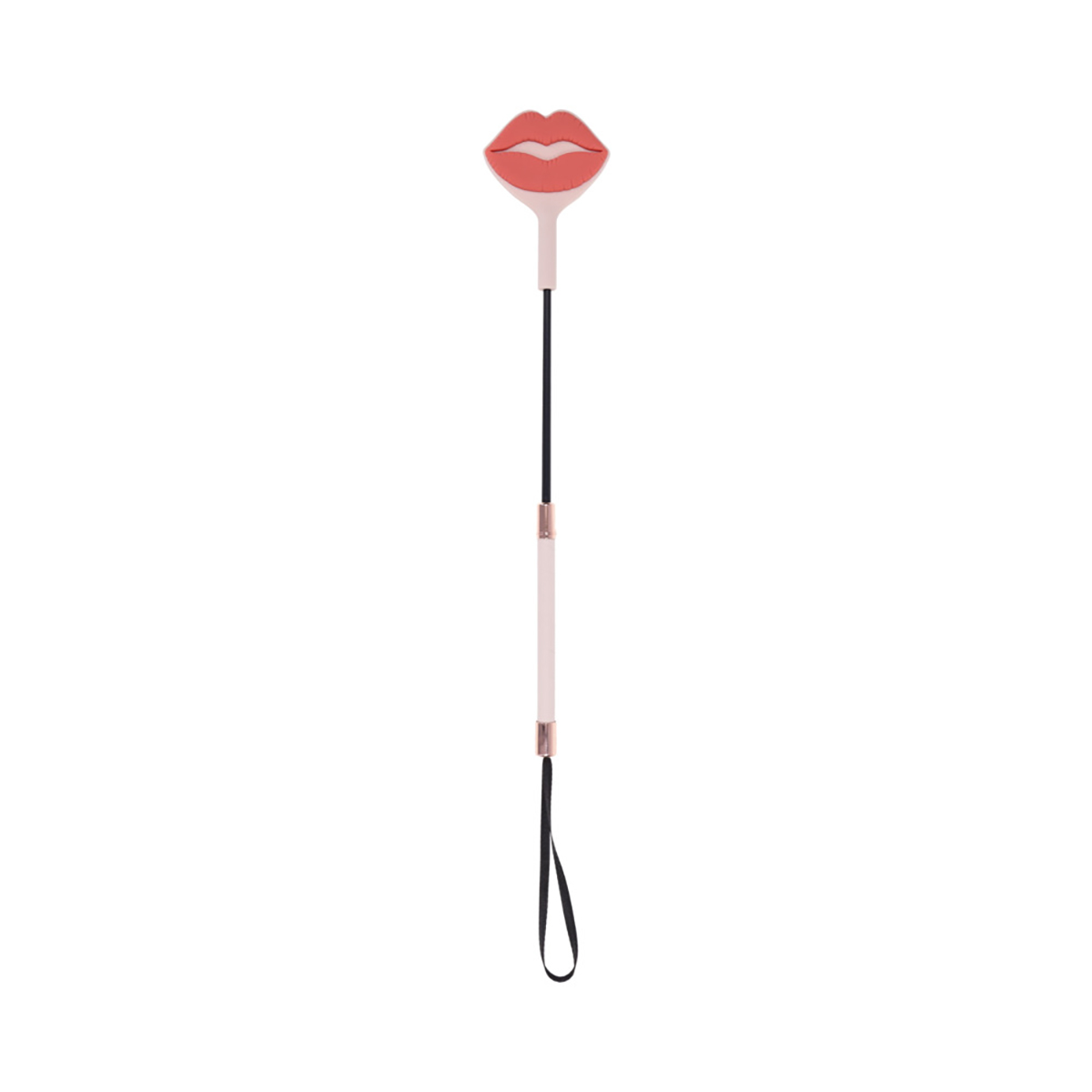 Seal the deal with a kiss they won’t forget. The Peaches ‘N CreaMe Kiss Crop features a soft, 100% silicone tip with a raised lip design that leaves a juicy kiss imprint with every well-aimed swat. The flexible yet firm tip delivers a sharp, satisfying sting that lingers on the skin and even longer in their memory. Adorned with gleaming rose gold accents and wrapped in peachy faux leather, the handle feels just as good in your grip as it looks. A matching wrist loop makes storage simple and impromptu play irresistible. With its flirty design and striking bite, this crop leaves a sensual mark that says, loud and clear: you were here.