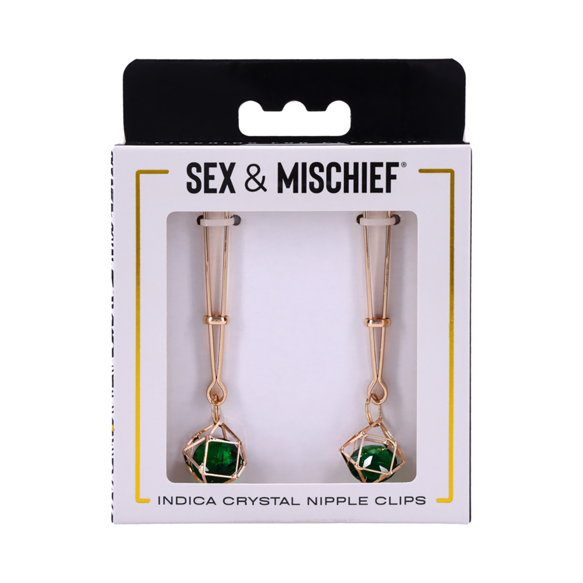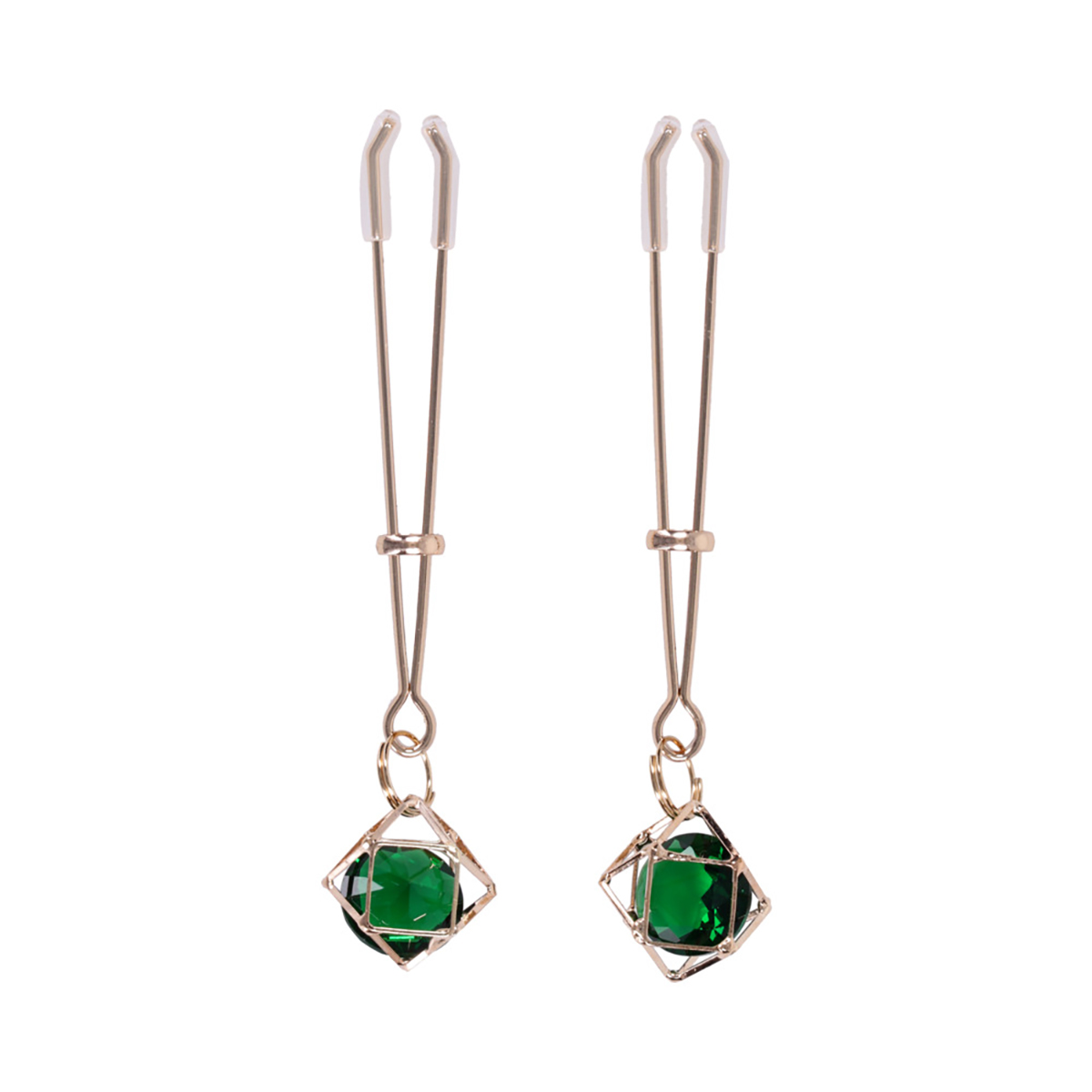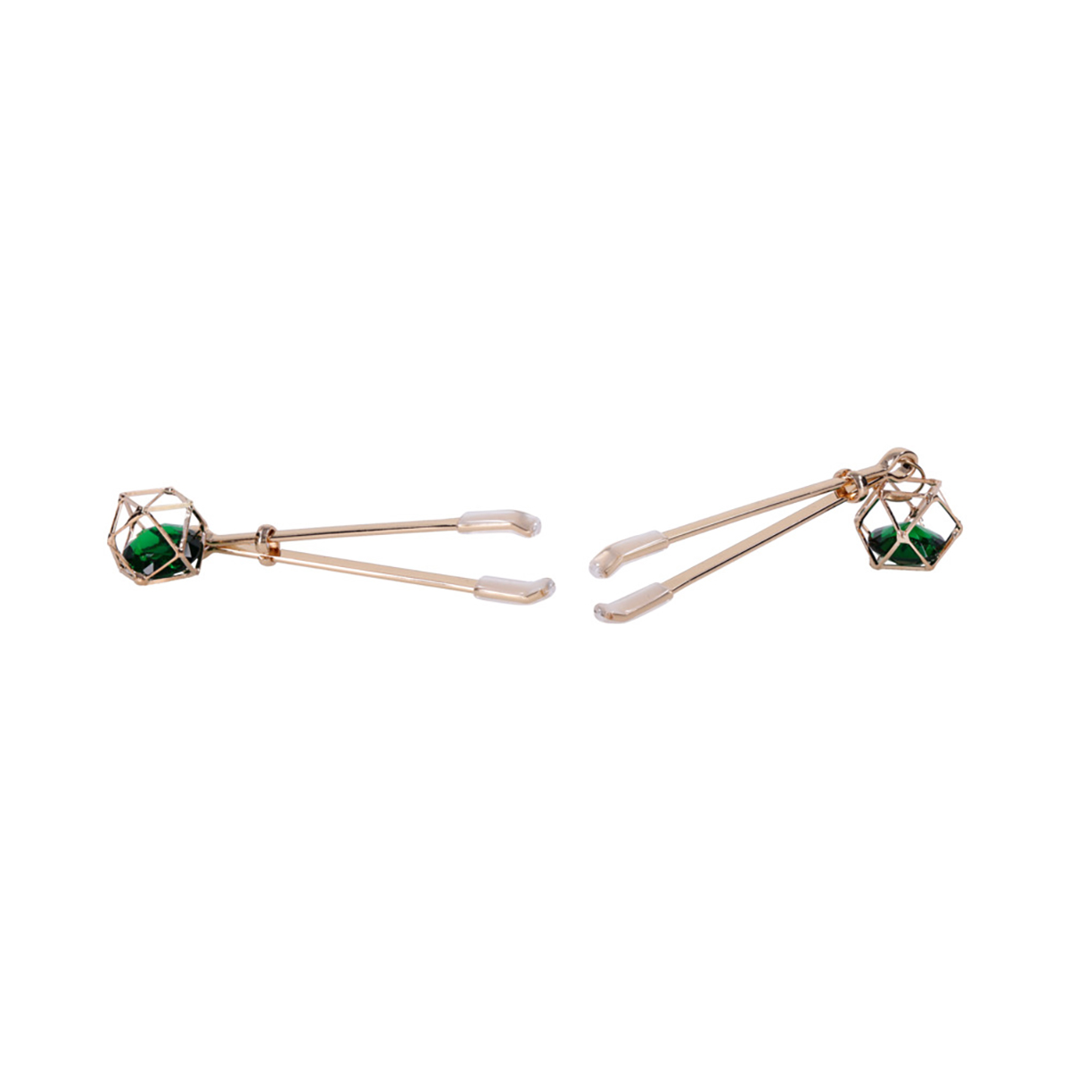 A touch of tease, a hint of pressure, and a whole lot of glam. The Indica Nipple Clips feature adjustable tension and soft rubber tips for comfort and control. A dangling green gem and gold hardware add a luxurious flair, making these perfect for visual and physical stimulation. Whether you’re dressing up for a scene or exploring sensation play for the first time, these clips deliver pleasure with style.