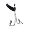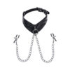 Elevate your scenes with the elegant dominance of the Velvet Noir Collar with Nipple Clamps. Crafted from smooth faux leather with a sleek marbled finish, this angled collar commands attention and control. Hematite-plated hardware, including a removable ring, offers both sophistication and functionality. A single metal chain connects to adjustable nipple clamps, adding a teasing element that can be removed for even more versatility. Use the collar with the clamps, swap in a leash, or wear it solo as a stylish day collar. Designed for both comfort and exploration, this piece invites you to play with power on your terms.