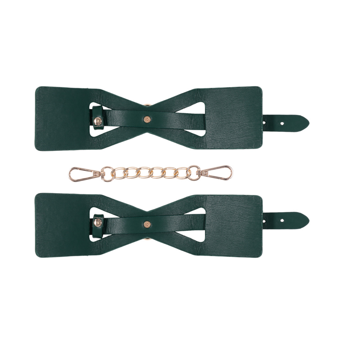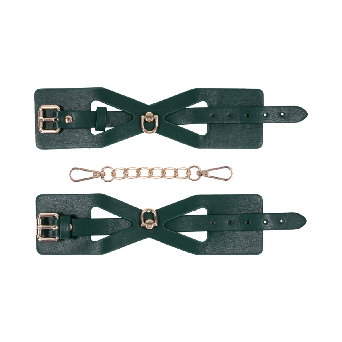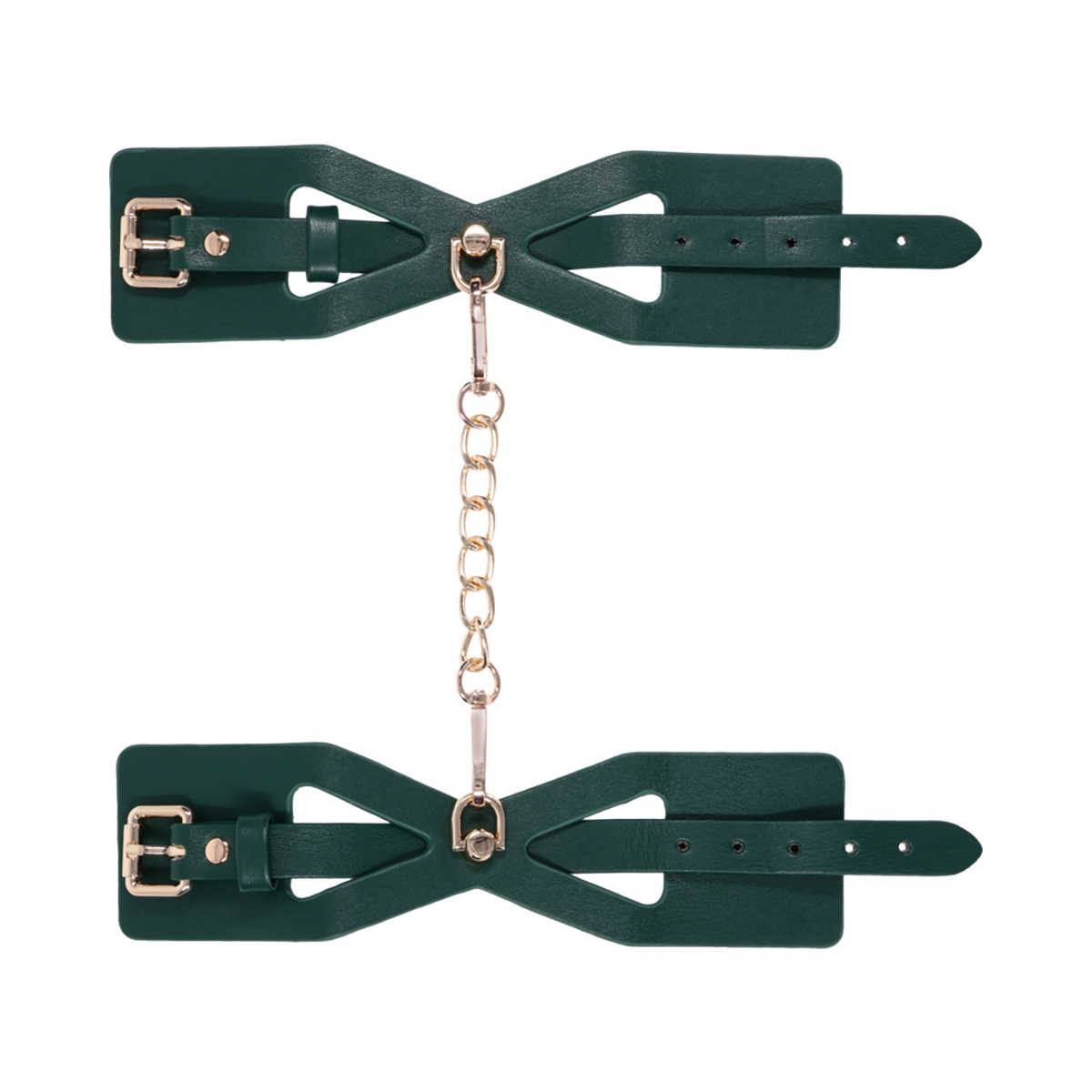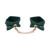 Get wrapped up in something irresistible. These emerald green cuffs feature dramatic cutout detailing to reveal more skin and spark more intrigue. Lined for softness and designed for visual seduction, they’re as comfortable as they are commanding. Use them to bind wrists together or attach to other Indica items for a coordinated scene. The gold chain and hardware add just the right touch of luxury to every surrender.