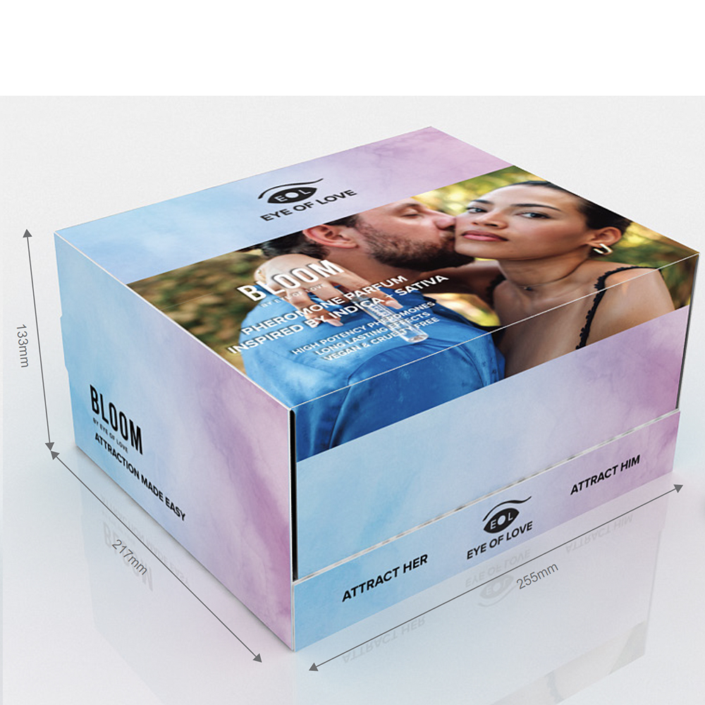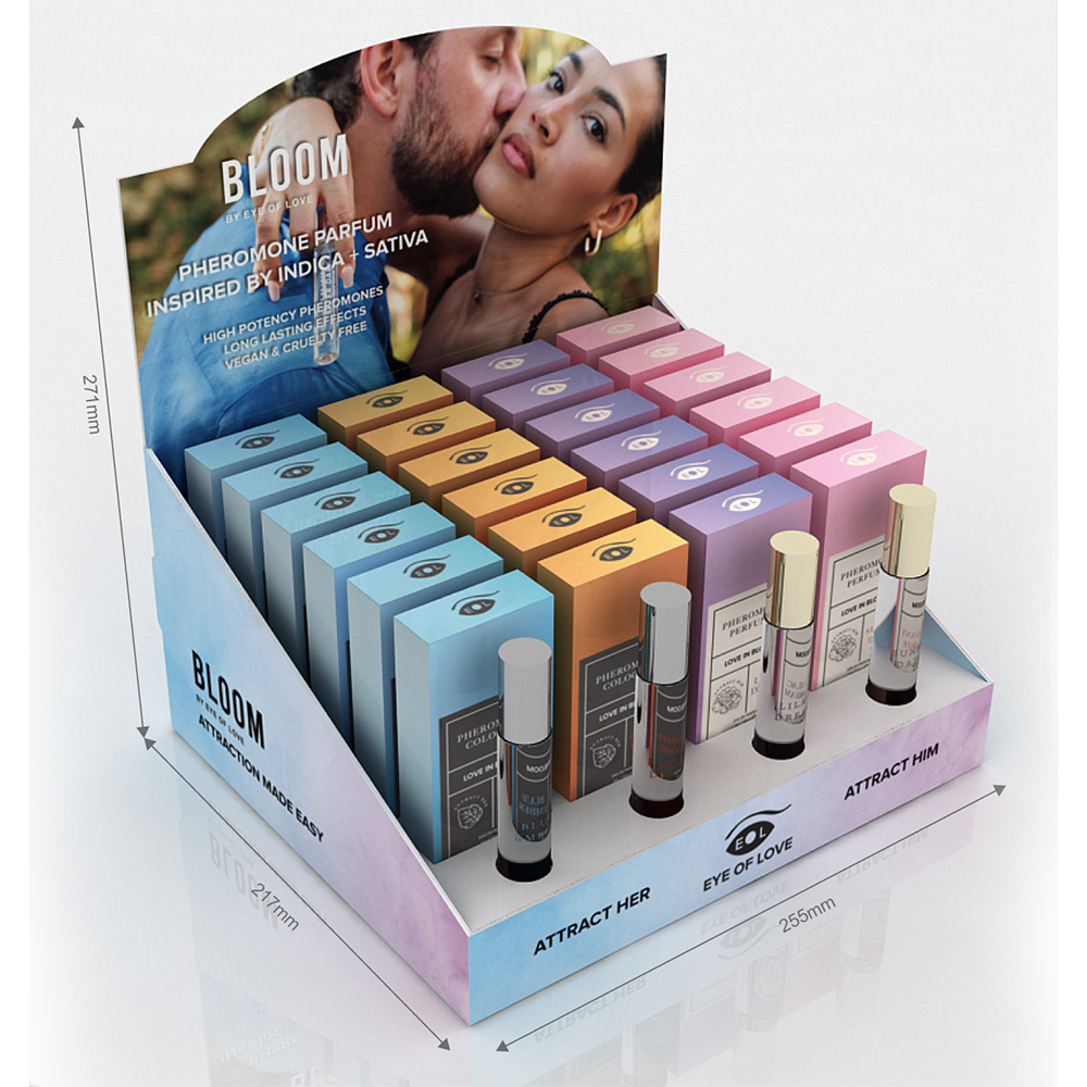 The Eye of Love Bloom 10ml display presents an enticing selection of pheromone perfumes, featuring two indica-inspired fragrancesLilac Dreams and Blue Emberand two sativa-inspired fragrancesSunny Daze and Earth’s Desire, designed to captivate both him and her. The display includes six bottles of each fragrance, along with testers for an immersive experience.