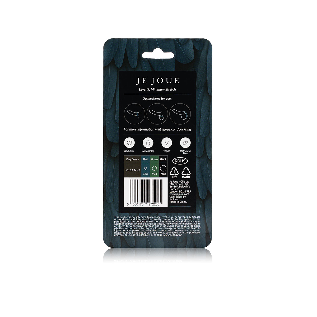 The minimum level of stretch provided by Je Joue’s Blue Level 3 ring is great for experienced users and/or those with less girth. It is recommended that this level only be used around the base of the penis or testicles, not both at the same time, depending on the wearer’s size.