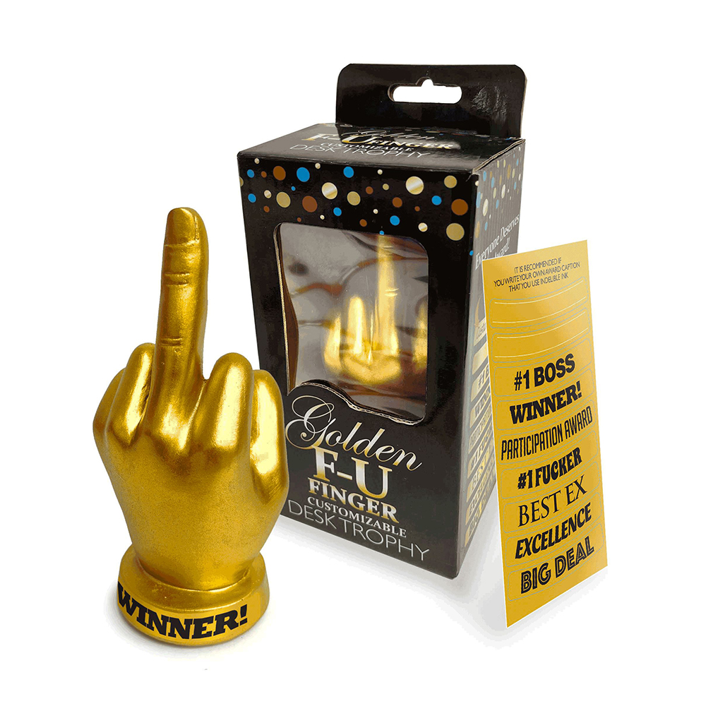 Recognize the Olympic level fucker in your home, school, office or team with the FU Finger Trophy. This 6 inch trophy is fully customizable for that unique fuckwad. Choose from our favorite accomplishments such as #1Boss, Winner, Participation Award, #1 Fucker, Best Ex, Excellence and Big Deal, or create your own. Never let another fucker in your life go unrecognized!