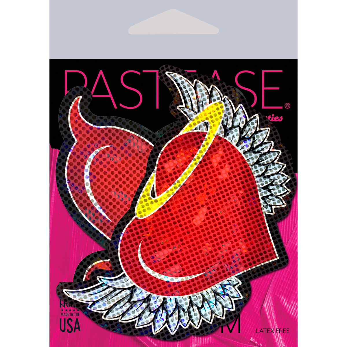 Angel & Devil Heart: Red Glitter Hearts with Wings, Halo, Horns & Tail Nipple Pasties by Pastease are hand-made in the USA of soft form-fitting glittery material that forms seamlessly to curves and resists wrinkling over hardening nipples.