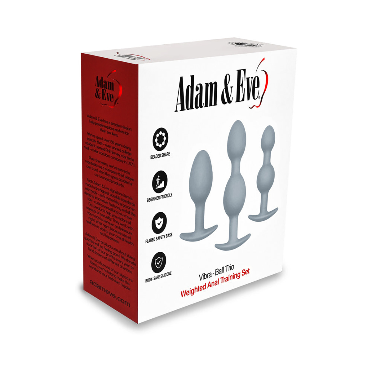 Get 3 great reasons to shake your tush with the Vibra-Ball Trio! This butt plug set comes with 3 beaded plugs in different sizes to take your anal skills from beginner to advanced in no time. Each plug has a rolling weight inside that shakes as you move for a vibrating-like sensation ? no batteries needed! They slip in easily with just a little lube thanks to their super-smooth finish. Beaded shapes add filling stimulation, while flared safety bases keep the plugs securely in place. Made from anal-friendly silicone.