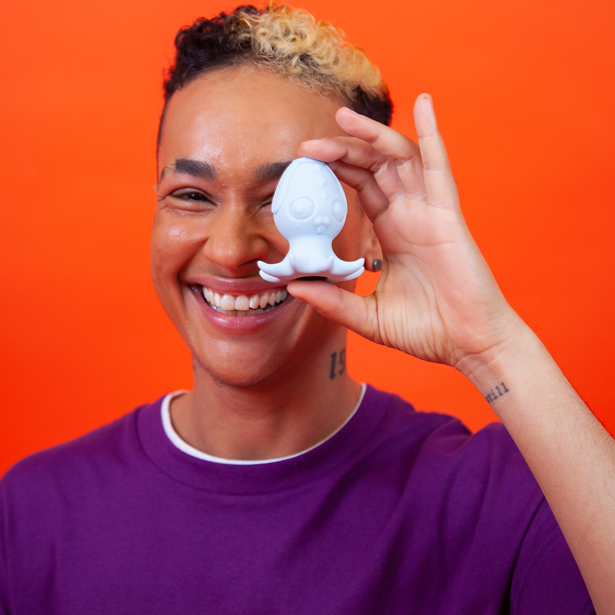 Princette Puppypus comes from a planet that is entirely covered in water, and so they love it when things are wet, whether from your body or your favorite lube. Our Princette makes a great vibrating butt plug, and is also so much more. They make a great stand-alone vibrator with a ring of independently buzzing legs on one side and a larger curved vibrating head on the other. Both the legs and the head make this Royal We easily grasped by all hands, and can slide between fingers for an open-handed explorative grip. Princette Puppypus is a versatile and euphoric friend.