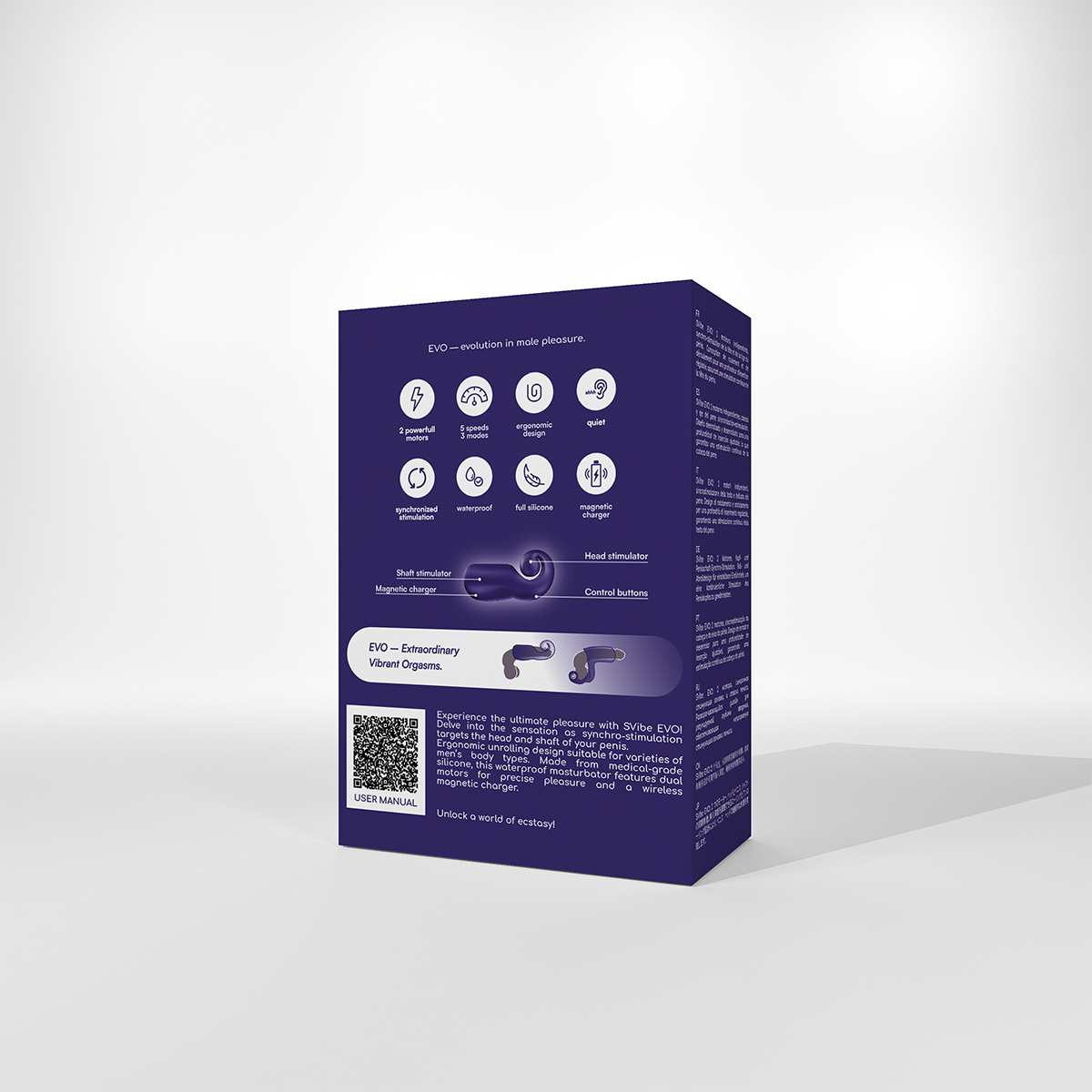 - Included in box: SVibe EVO, Protective Case, Charging Cable, Instruction Manual; pleasure guide brochure