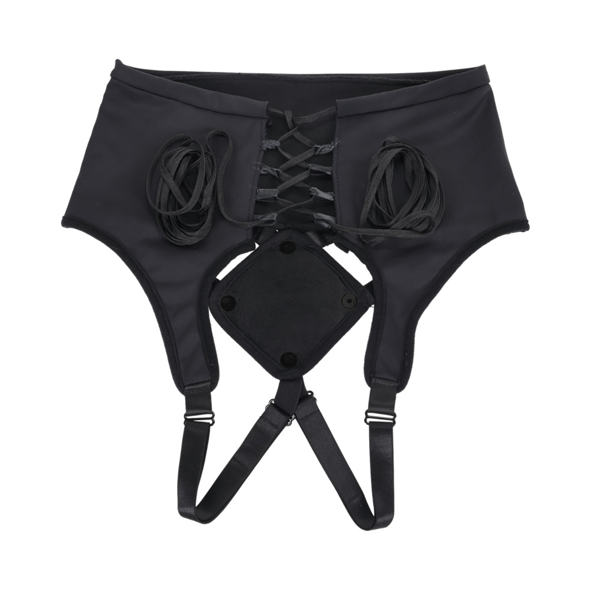 - Six adjustable elastic bands connect front padding for precise dildo placement