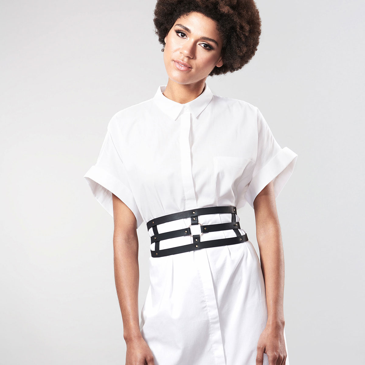 The most wanted accessory with a hidden double use. Not only does its design mean it can be worn with either dresses or jeans, but it also turns into handcuffs with straps to unleash fantasies. Measures at the waist 32.68″ maximum and 23.62″ minimum.