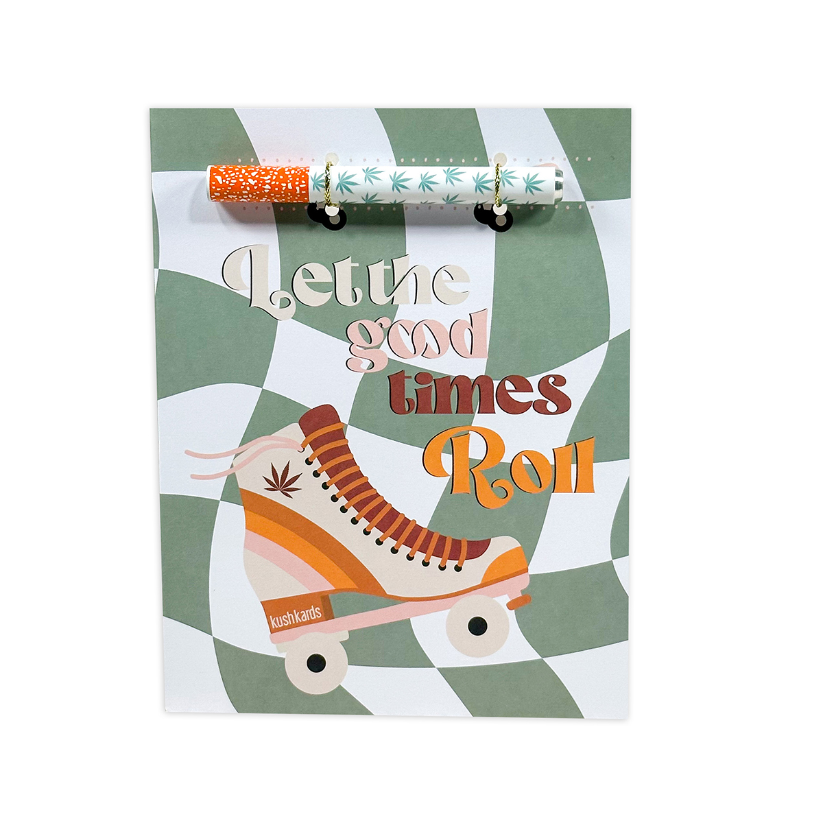A card for rollin’ in the good times. There are so many ways to roll and here is the perfect card to do just so! This brand-new retro cannabis greeting card can be used for any occasion, so pick it up and write a message on the inside and give this card just because! Get this KushKard with the matching one hitter and add your own flowers. However you roll, I hope it’s good.