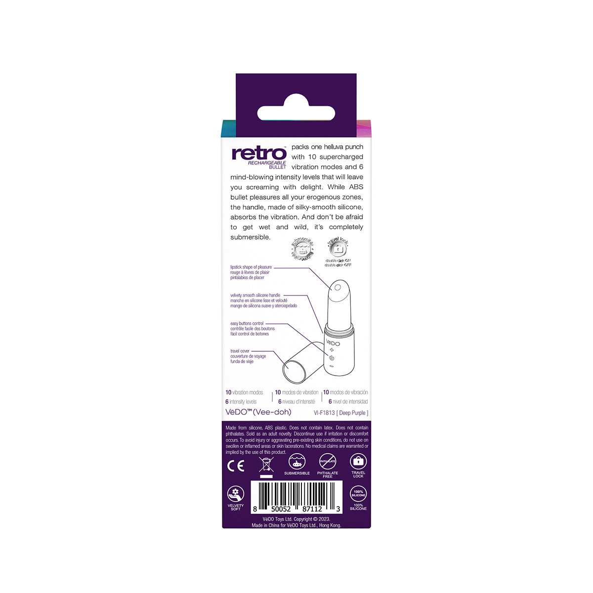 Retro Rechargeable Bullet packs one helluva punch with 10 supercharged vibration modes and 6 mind-blowing intensity levels that will leave you screaming with delight. While ABS bullet pleasures all your erogenous zones, the handle, made of silky-smooth silicone, absorbs the vibration. And donft.t be afraid to get wet and wild – itft.s completely submersible.