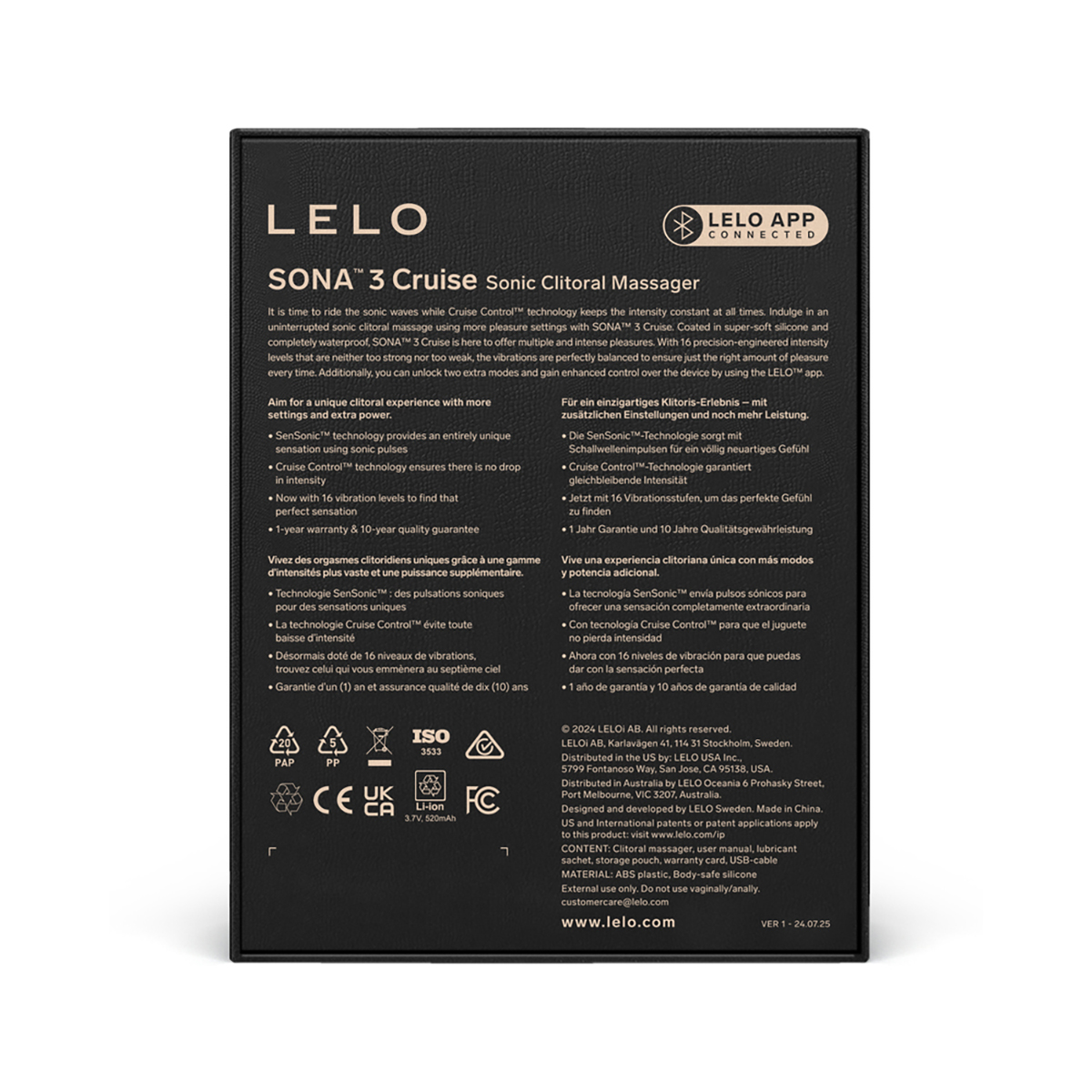 It is time to ride the sonic waves while Cruise Control technology keeps the intensity constant at all times. Indulge in an uninterrupted sonic clitoral massage using more pleasure settings with SONA 3 Cruise. Coated in super-soft silicone and completely waterproof, SONA 3 Cruise is here to offer multiple and intense pleasures. With 16 precision-engineered intensity levels that are neither too strong nor too weak, the vibrations are perfectly balanced to ensure just the right amount of pleasure every time. Additionally, you can unlock two extra modes and gain enhanced control over the device by using the LELO APP. By connecting with LELO APP you can now try special new feature LOVE BRIDGE that will bring you long distance relationship even closer. Come together with your partner and connect using the Love Bridge feature in your app. Set up your naughty but discreet chat room, seamlessly switch control over each other’s LELO app-connected devices in real time, and explore new sensations no matter the distance. SmoothRise technology aims to heighten your pleasure without distracting jumps in intensity, allowing you to glide through vibration modes effortlessly. This seamless, gradual build lets you focus solely on your satisfaction, ensuring every level is comfortable yet thrilling as you unlock the smoothest path to orgasm, one gentle rise at a time.