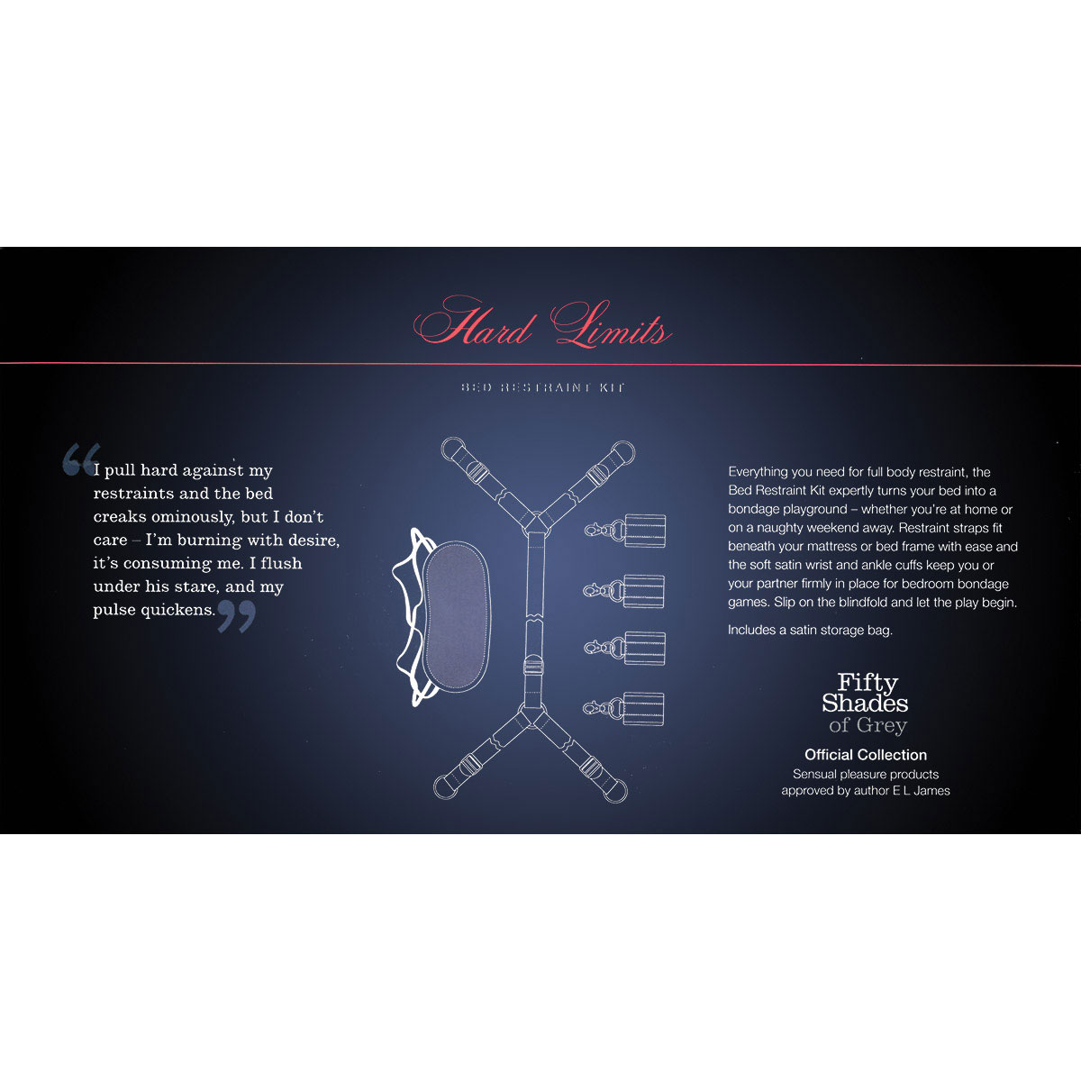 <p>Transform your bed into a bondage playground and enjoy the fettered throes of lust in soft satin. Ideal for beginners, this bedroom bondage set can be used to create a full body restraint that’s quick and easy to secure. 4 soft cuff restraints with velcro fastening make easy work of full body bondage, allowing you to focus entirely on your pleasure. Connect the cuffs together as handcuffs or ankle restraints using the incorporated swivel clips, or append them to the included bed straps for a firmer restraint that securely binds you to your bed. Simply place the bed straps beneath your mattress and adjust the length and widths to size, creating a platform for wrist and ankle restraint without the need for a bed frame or any specialist equipment. Adjustable to fit single, double, kingsize and super-kingsize beds and easy to fold down to a portable size for storage and easy travel, this set is ideal for couples to whom discretion is key. The strap system measures 49 inches in length with two widths for the cuffs to attach, each measuring 98 inches across. 4 straps protrude from beneath your mattress, exposing 4 O-rings to which the cuffs connect, forming your bondage restraint. Part of the Fifty Shades of Grey The Official Pleasure Collection approved by author E L James. Supplied with a Fifty Shades of Grey storage bag, this bed restraint kit is the ideal erotic gift for fans of the trilogy.</p>