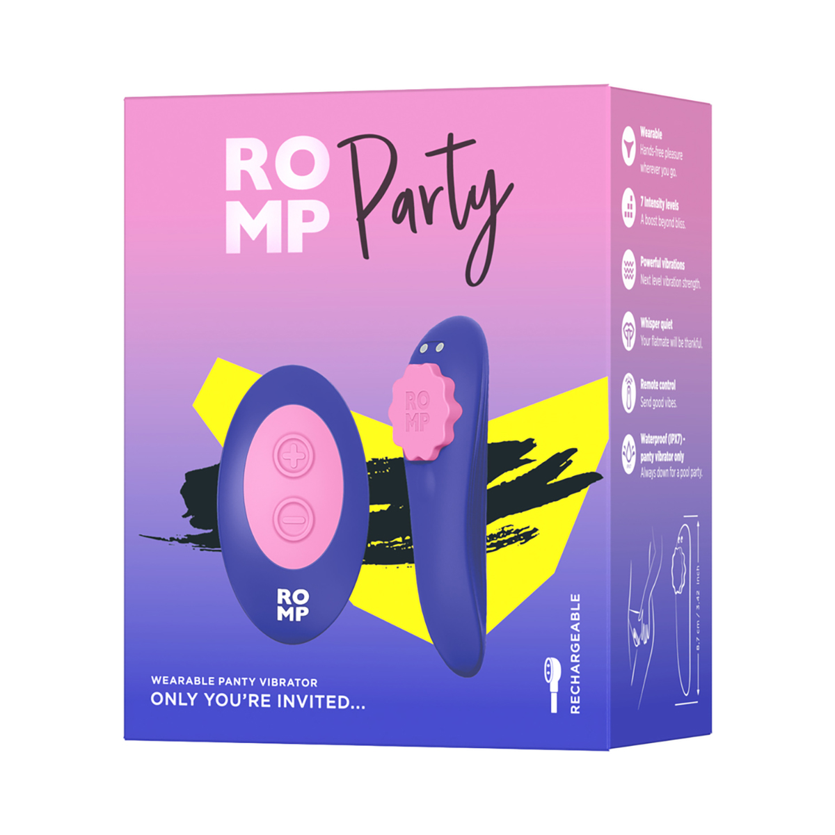 ROMP Party is a remote-controlled panty vibrator designed for on-the-go clitoral stimulation. With 7 intensity levels, this discreet treat easily snaps into place for kinky adventures in solo and partnered play.